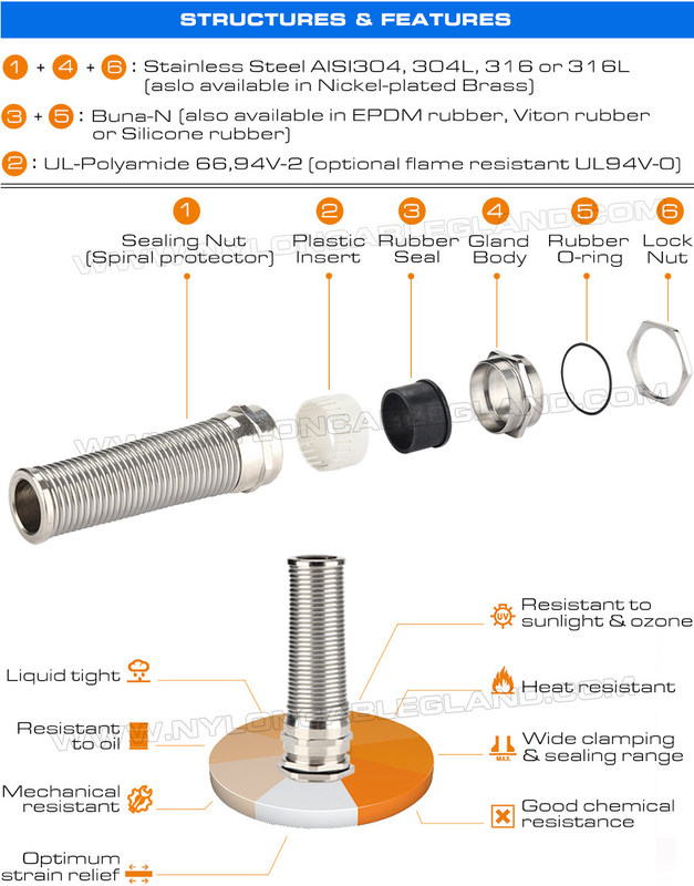 Обладая такими преимуществами, как высокая ударопрочность и широкий диапазон зажима, устойчивость к высоким и низким температурам и атмосферным воздействиям, герметичные метрические кабельные вводы IP68 M12 ~ M50 из нержавеющей стали типа 304/316/316L с защитой от перекручивания и изгиба поставляются с дополнительной спиральной защитной пружиной. и обладает химической стойкостью, коррозионной стойкостью и термостойкостью, а также обладает высокой прочностью на разрыв, высокой прочностью, хорошей водостойкостью, отличной защитой от изгиба и длительным сроком службы.