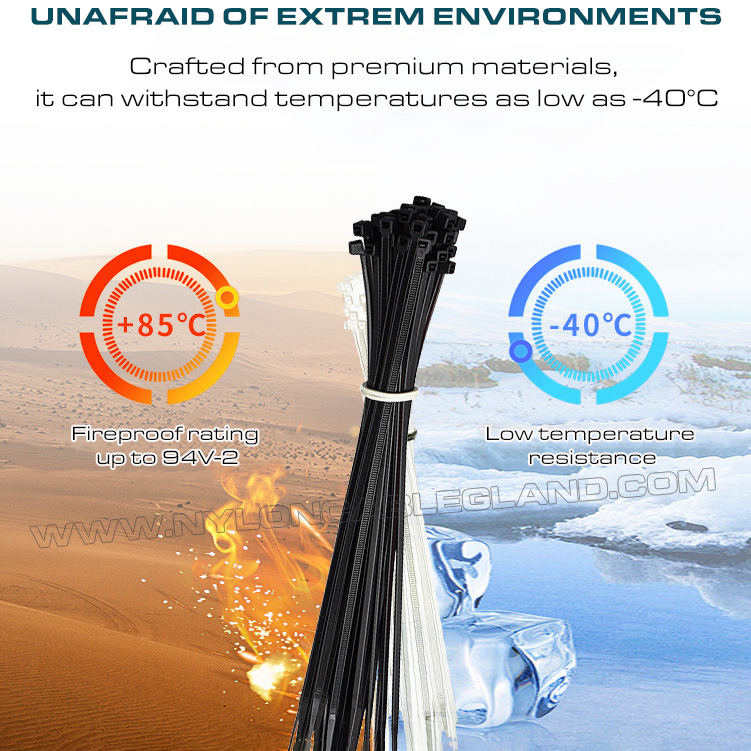 (1) Отличная стойкость к ударам холода: Это главное преимущество нейлоновых кабельных стяжек, устойчивых к низким температурам, а это означает, что они сохраняют прочность при экстремально низких температурах и не подвержены хрупкости и разрывам.