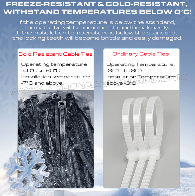 Кабельные стяжки устойчивые к низким температурам (также известные как морозостойкие кабельные стяжки хомуты) это нейлоновые кабельные стяжки, предназначенные для эксплуатации в условиях низких температур. Они изготовлены из специального нейлона, устойчивого к низким температурам (например, модифицированного полиамида 6.6). Их преимущества включают в себя отличную стойкость к ударам холода (стойкость к хрупкому разрушению), высокую прочность, высокую износостойкость, хорошую размерную стабильность, а также отличную химическую стойкость и электрические свойства. Они сохраняют свою прочность, ударную вязкость и хрупкость при экстремально низких температурах (например, -40°C), что ниже, чем у стандартного нейлона. Они специально используются для фиксации оборудования в условиях низких температур или в промышленных условиях, где требуется надежность и безопасность материалов при низких температурах.