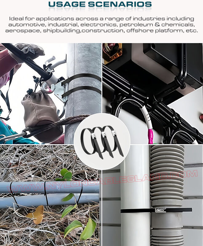 • Судостроение и морская техника: жгутование кабельных лотков; армирование пожарных шлангов; Крепление оборудования и кабелей в коррозионных морских средах, таких как соляной туман.