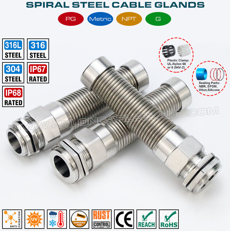 Гибкие кабельные вводы кабелни щуцери из нержавеющей стали (также известные как спиральные кабельные сальники гермовводы из нержавеющей стали) являются защитными элементами, используемыми при соединении кабелей и оборудования. Их основные особенности включают предотвращение чрезмерного изгиба кабеля, обеспечение водонепроницаемого уплотнения и изготовление из нержавеющей стали. В них используется специальная пружина или гибкая конструкция для амортизации и распределения нагрузки на кабель в месте выхода, обеспечивая при этом герметичность и стабильность кабельного соединения. Они состоят из корпуса из нержавеющей стали, спирального защитного элемента, уплотнения, пластиковой вставки, уплотнительного кольца и контргайки.